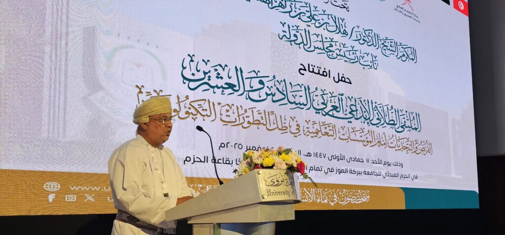 نزوى /العُمانية/ انطلقت اليوم في جامعة نزوى فعاليات الملتقى الطلابي الإبداعي العربي السادس والعشرين، الذي يُنظمه المجلس العربي للتدريب والإبداع الطلابي تحت عنوان “الفرص والتحديات أمام المؤسسات التعليمية في ظل التطورات التكنولوجية”.