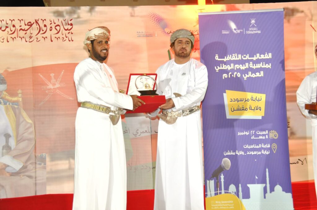 تزامناً مع احتفالات البلاد باليوم الوطني لسلطنة عمان أقيمت مساء يوم السبت 22 نوفمبر ٢٠٢٥م بناية مرسودد بولاية مقشن أمسية ثقافية وشعرية تحت رعاية سعادة الشيخ هلال بن علي المعمري والي مقشن بحضور عدد من المسؤولين والشيوخ والمواطنين وذلك امام قاعة المناسبات بالنيابة. في بداية الحفل القى سهيل بن سعيد سالم غصنه مسن نائب والي مقشن بنيابة مرسودد كلمه رحب فيها بالحضور وتحدث عن اليوم الوطني ليس يوم عابر بل يوم تجدد فيه المشاعر بالفخر والولاء لمسيرة وطن سجل عبر تاريخه منذ 281 عام منجزات شامخه ونهضه راسخه وارثا تفتخر به الاجيال عبر مسيرة سلاطين عظماء ويواصل مسيرتها المباركه حضرة صاحب الجلاله السلطان هيثم بن طارق المعظم حفظه الله برؤيه طموحه امتداد لعمق الحضارة العمانية العريقة وحاضر مزدهر ومستقبل مشرق يمضي بثبات نحو الرفعة والتقدم ..