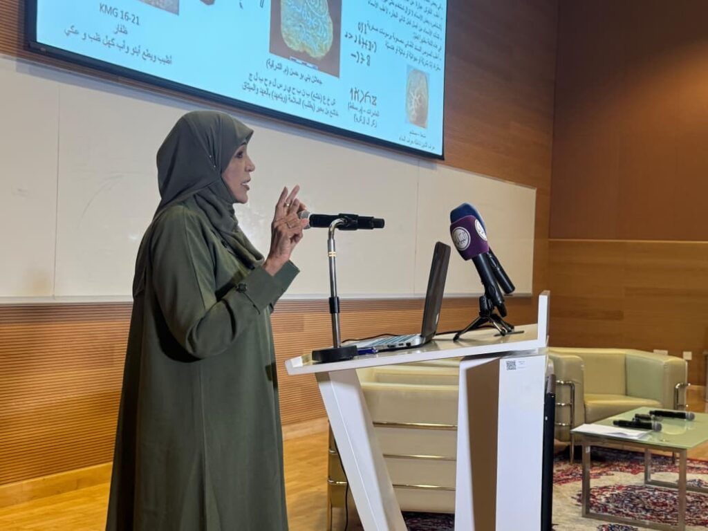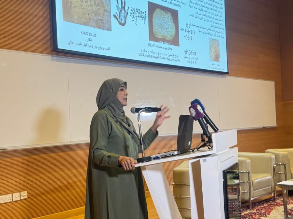 و عرضت مجموعة من القطع الأثرية التي تحمل رموز مبكرة كتبت بخط المسند الطفاري يعود عمرها إلى الالف الثالث قبل الميلاد أي ان عمرها الان 4200 سنة حسب تحليل كربون ١٤ التي تعتبر الملهم الأول لها في فك شفرة هذا النظام الكتابي العريق وأن أصل لغة هذه الكتابة عربية وأوضحت انها تتبعت أصل الحرف العربي فوجدت أن لكل حرف قصة كما أوضحت الخصائص التي تميّز نقوش جنوب عُمان وقراءتها لنماذج منها أمام الحضور وأن نظام الكتابة العربي الجنوبي القديم العُماني واليمني وصل إلى الهند والصين وبلدان أوروبا عبر شواهد أثرية ونقوش تثبت حضوره العالمي، مشيرة إلى أن العالم ما يزال يستخدم الحروف العربية القديمة في العديد من اللغات والأنظمة الكتابية.