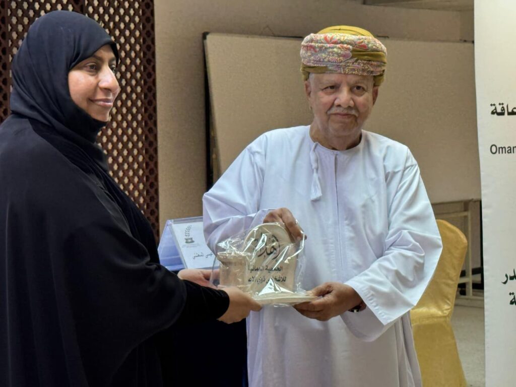 وفي الختام تفضل سعادة حامد بن عوض صواخرون عضو مجلس الشورى ممثل ولاية صلالة وأمال آل إبراهيم والدكتور محمد الغساني مدير مكتبة دار الكتاب رئيسة اللجنة الاجتماعية بالمجلس البلدي ورئيسة مجلس إدارة الجمعية العمانية للأشخاص ذوي الإعاقة بظفار لتكريم المشاركين وتقديم هدية تذكارية لسعادة راعي المناسبة من أعمال أعضاء الجمعية العمانية للأشخاص ذوي الإعاقة.