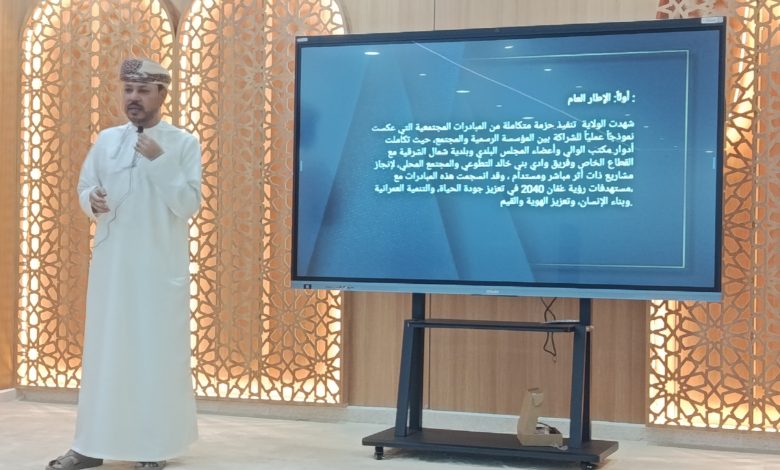 أُقيمت اليوم في ولاية وادي بني خالد بمحافظة شمال الشرقية ندوة تنموية بعنوان ‘” وادي بني خالد.. رؤيةٌ مشتركة وتنميةٌ متكاملة” التي تهدف إلى مناقشة واقع ومستقبل التنمية في الولاية. رعى المناسبة سعادة الشيخ محمد بن أحمد الجنيبي والي ولاية بني خالد بحضور عدد من مسؤولي المؤسسات الحكومية والخاصة وعدد من المشايخ والرشداء وأبناء الولاية وتناولت الندوة 3 محاور تحدث فيها عيس بن سعيد الصلتي مدير إدارة الثقافة والرياضة بمحافظة شمال الشرقية عن دور الفرق الأهلية في تمكين الشباب وتحقيق رؤية “عُمان 2040” وأهمية نشاط الفرق الأهلية ودورها في تنمية الشباب وإبراز مواهبهم المتنوعة والمختلفة.