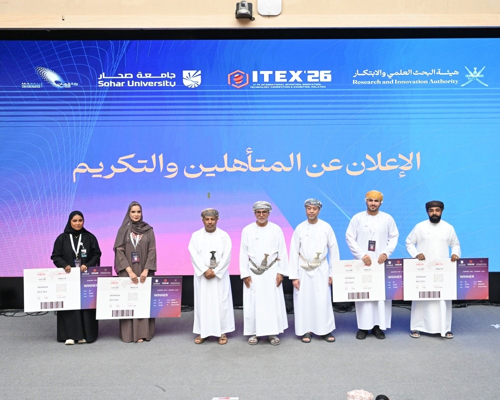 صُحار /العُمانية/ أعلنت هيئة البحث العلمي والابتكار اليوم بجامعة صحار المتأهلين الأربعة لتمثيل سلطنة عُمان للمشاركة في المعرض الدولي للاختراع والابتكار والتكنولوجيا 2026 ITEX الذي سيقام في مركز مؤتمرات كوالالمبور بماليزيا في 18 مايو المقبل.
