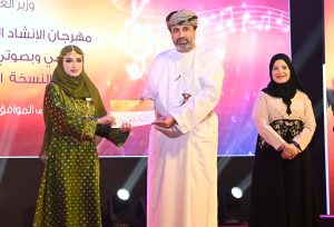 تضمن الحفل عرض الأعمال الفائزة في مجال الفن التراثي، حيث قدم طلبة تعليمية محافظة مسندم نشيد “فوق هام السحاب” الفائز بالمركز الأول، من كلمات مريم بنت سعيد السعدي، فيما قدم طلبة تعليمية محافظة جنوب الباطنة نشيد “هيثم سليل المجد” الفائز بالمركز الثاني، من كلمات مريم بنت مصطفى السلماني، وأنشد طلبة تعليمية محافظة الظاهرة “عُمان يا دار الكرام” الفائز بالمركز الثالث، من كلمات رهف بنت زاهر الجابري.